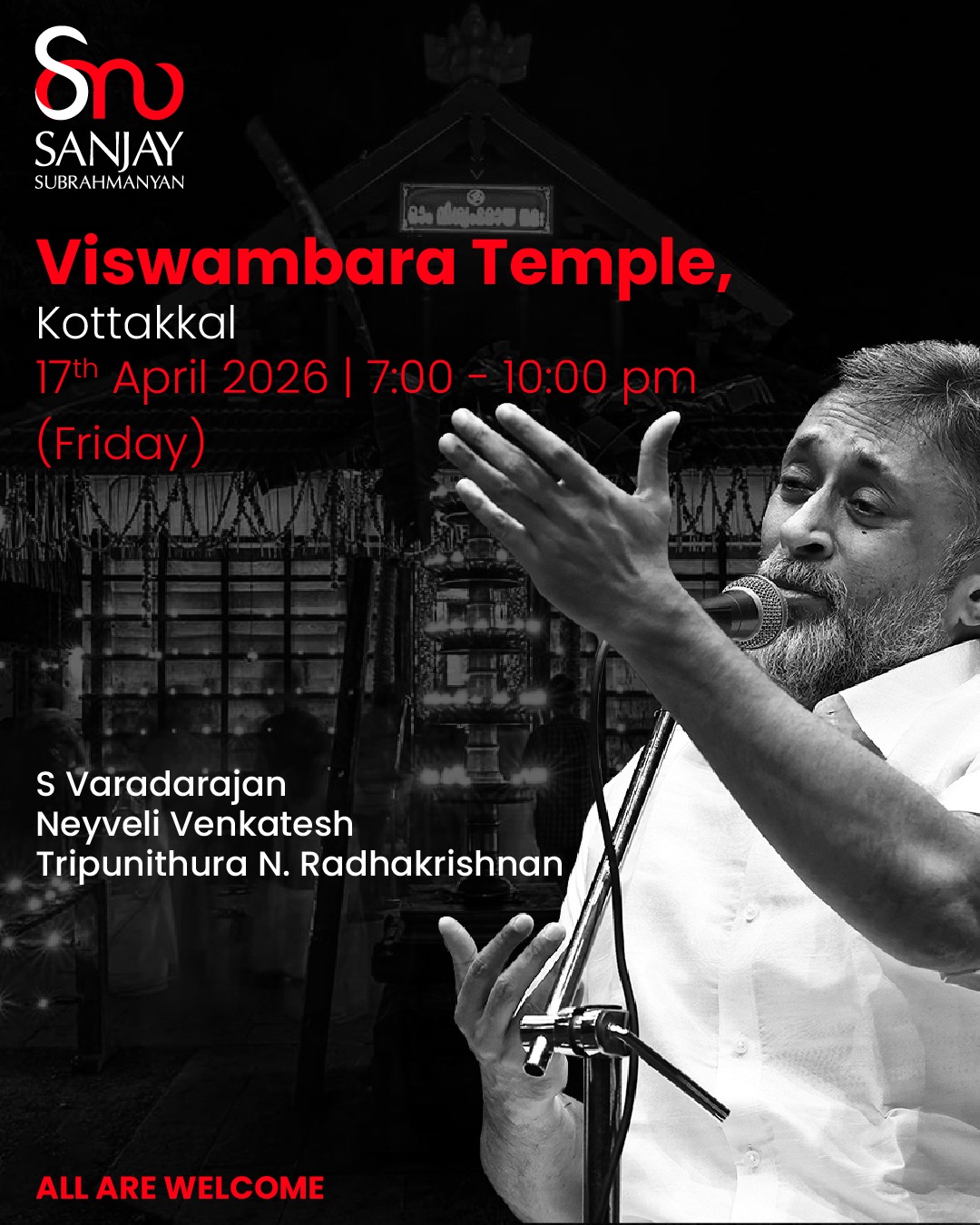Sanjay Sabha Live is a premium Carnatic concert series led by maestro Sanjay Subrahmanyan, accompanied by top-tier artists like S. Varadarajan (violin) and Neyveli B. Venkatesh (mridangam). The concerts present Carnatic music in its purest form—rich alapanas, challenging RTPs, and a diverse repertoire across Tamil, Telugu, Sanskrit, and Kannada.